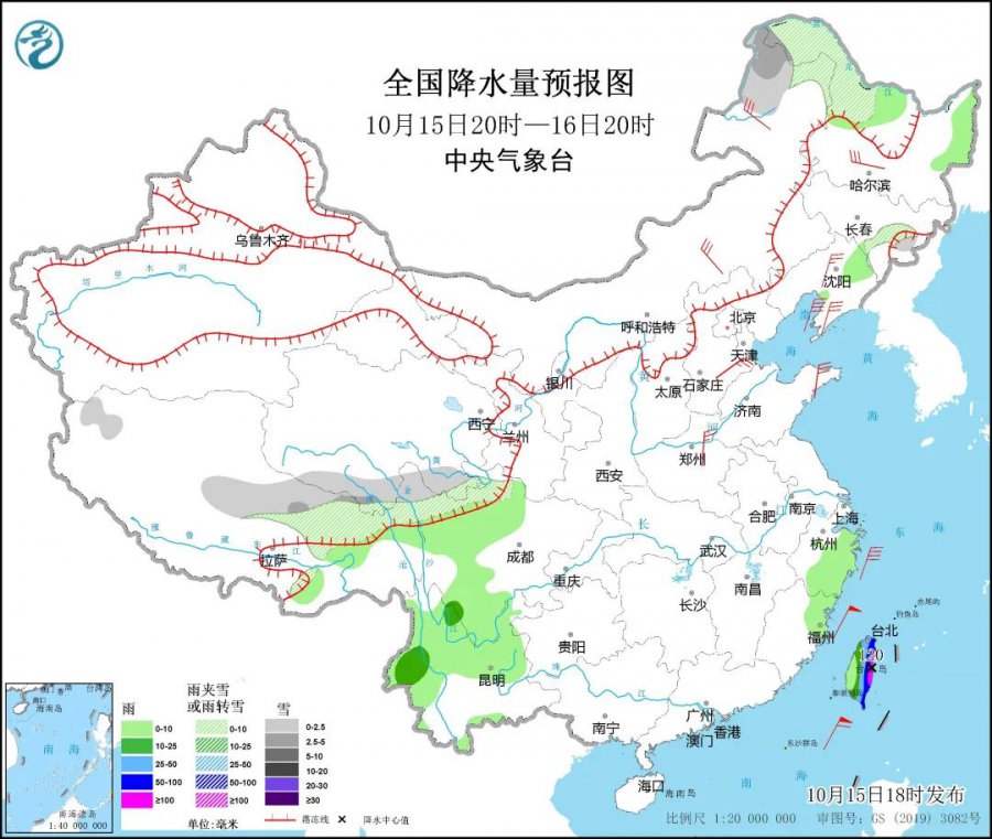 今日天气:内蒙古东北部、黑龙江西北部、西藏北部、青海南部、川西高原北部等地部分地区有小到中雪或雨夹雪;台湾岛东部的部分地区有暴雨或大暴雨。