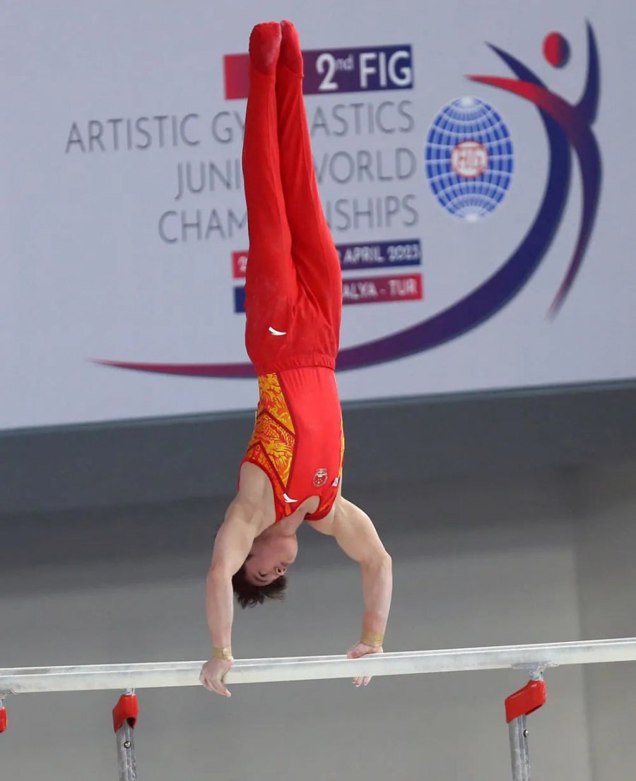 3月31日,中国选手覃国欢夺得2023年体操世青赛男子全能决赛金牌。
