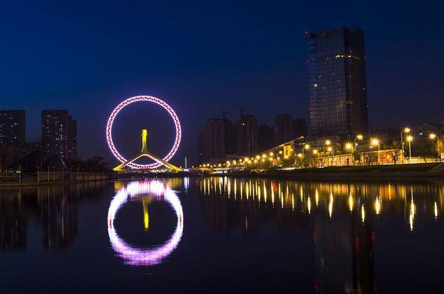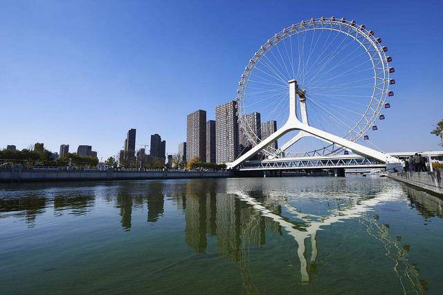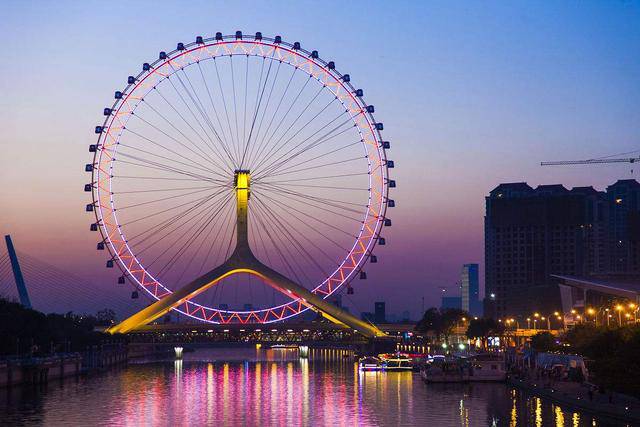 天津永乐桥摩天轮,是一座跨河建设、桥轮合一的摩天轮,兼具观光和交通功用,是中国十大城市地标建筑之一。