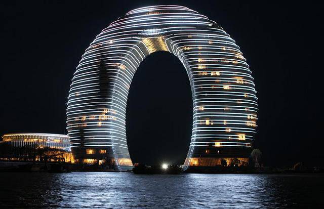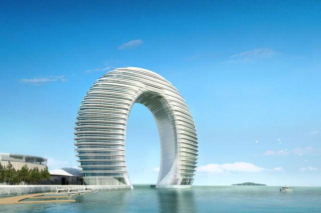 湖州喜来登酒店,它像一个倒U状的马蹄,类似于传统中国画中描绘的旧桥,很有创意。