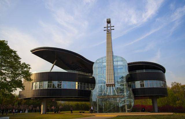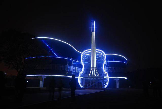 白天,黑色镜面的琴身和旁边依靠的透明小提琴呈现出优雅迷人的画面。而日落之后,小提琴和钢琴的边框被灯光勾勒出的线条更显迷人。这座浪漫的建筑落成之后吸引了不少外地情侣千里迢迢前来取景留念。