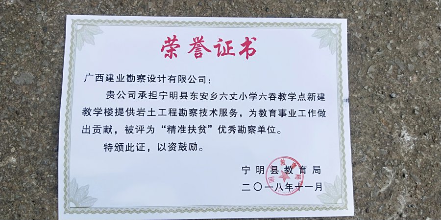 宁明县教育局授予广西建业勘察设计有限公司“精准扶贫”优秀勘察单位的荣誉称号